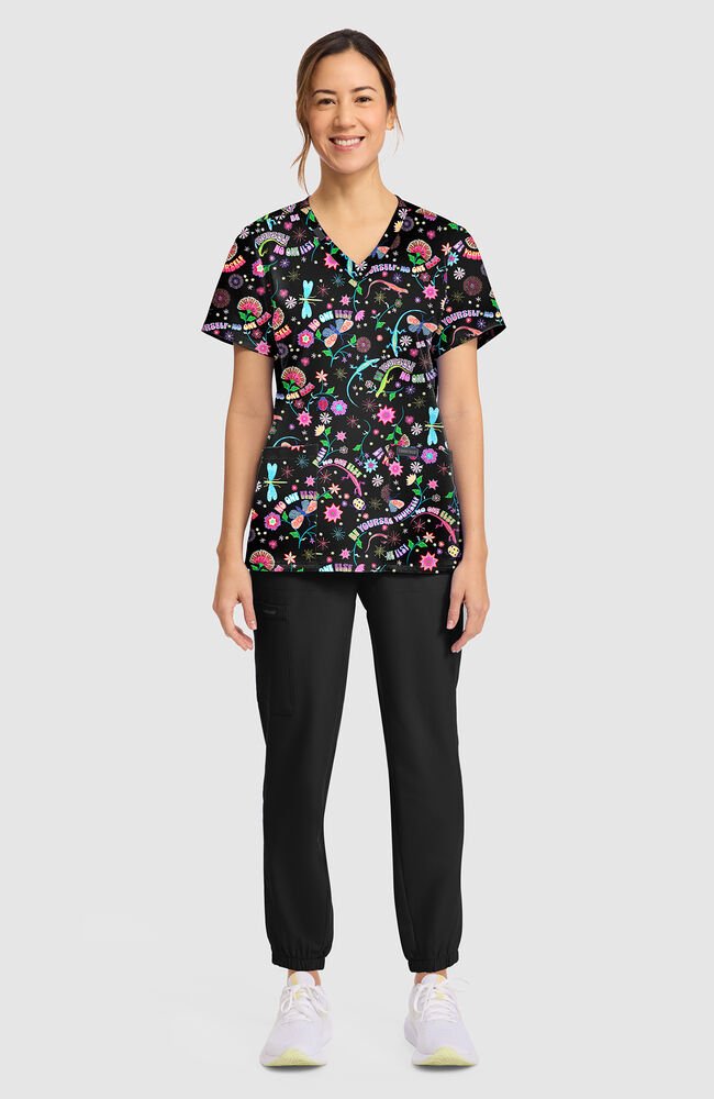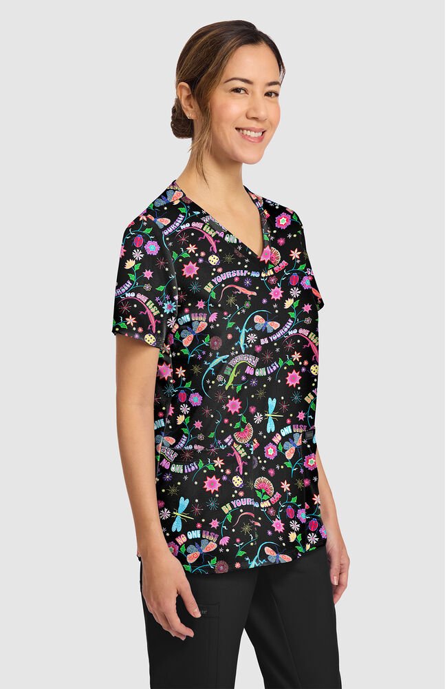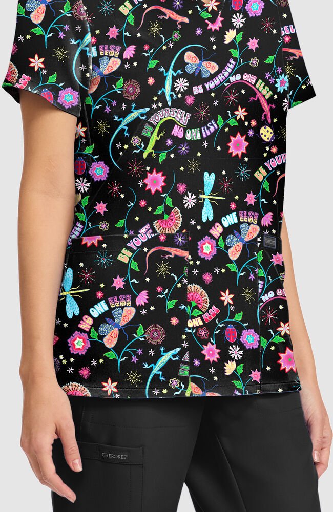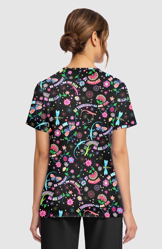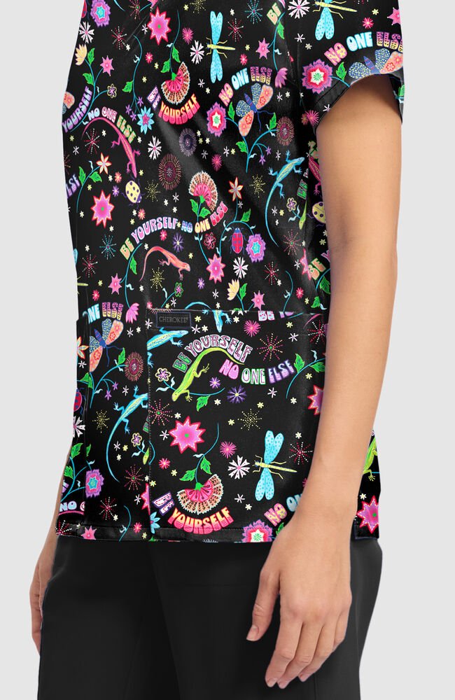 Estampado dama libélula Brillante, expresiva y diseñada para destacar, este delantal medico con estampado Celebrate You para mujer Fashion Prints aporta energía positiva a tu uniforme de diario.