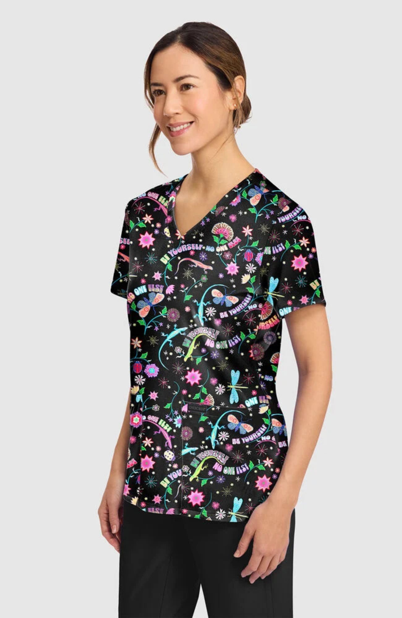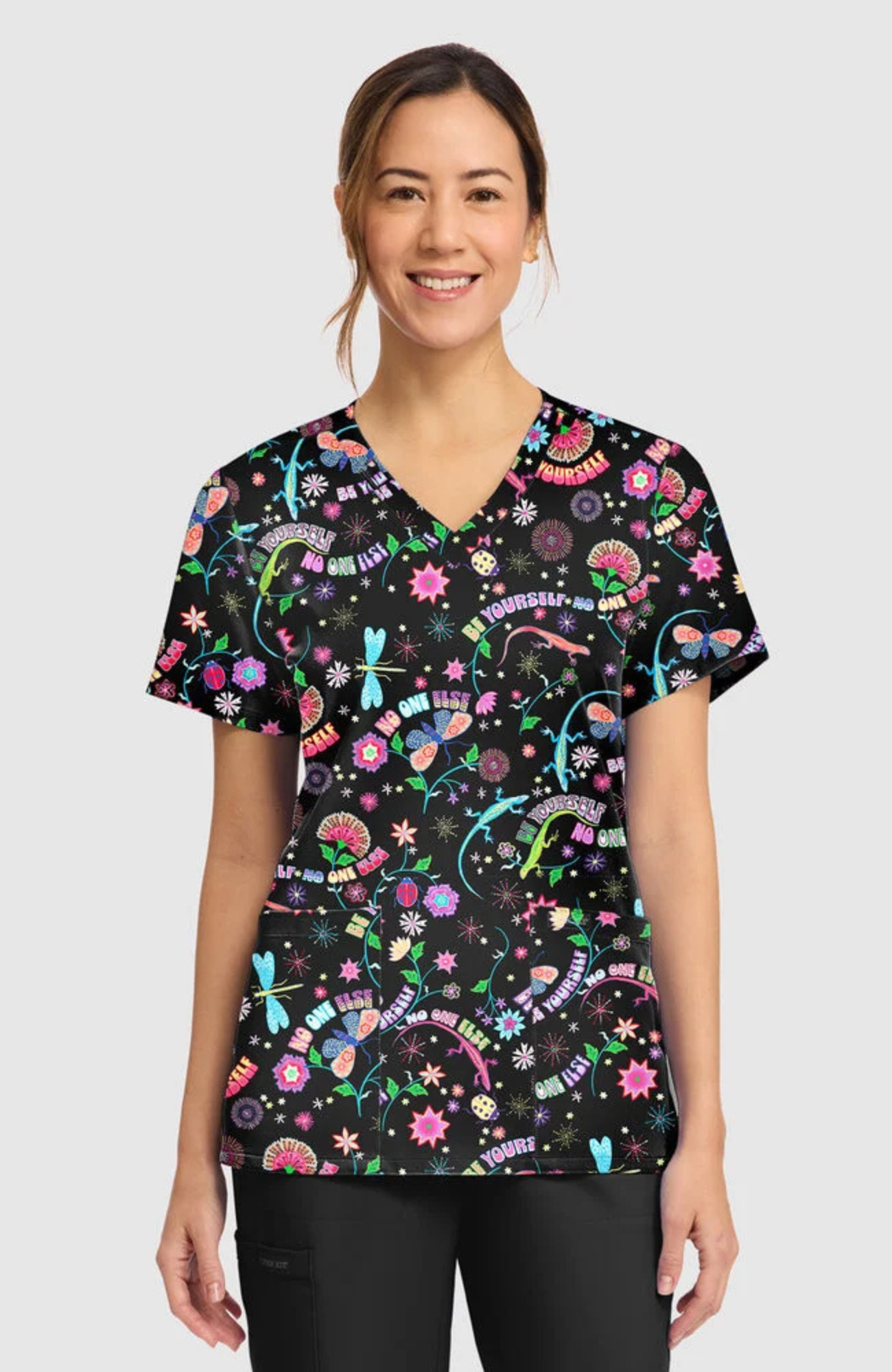 Sobre una base negra, la vibrante combinación de flores coloridas, estrellas y letras divertidas crea un look seguro, divertido e imperdible. Su clásico escote en V con una práctica trabilla para la insignia la hace funcional, mientras que los dos bolsillos frontales ofrecen fácil almacenamiento para tus artículos esenciales.