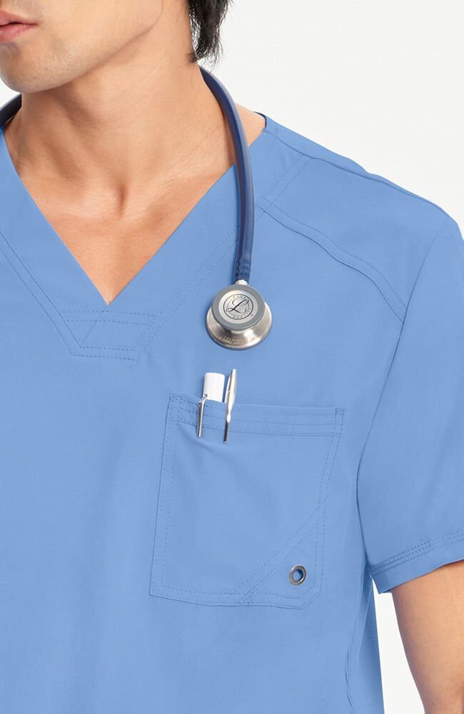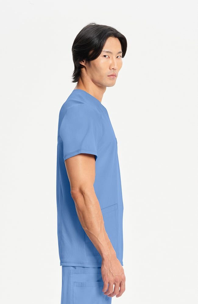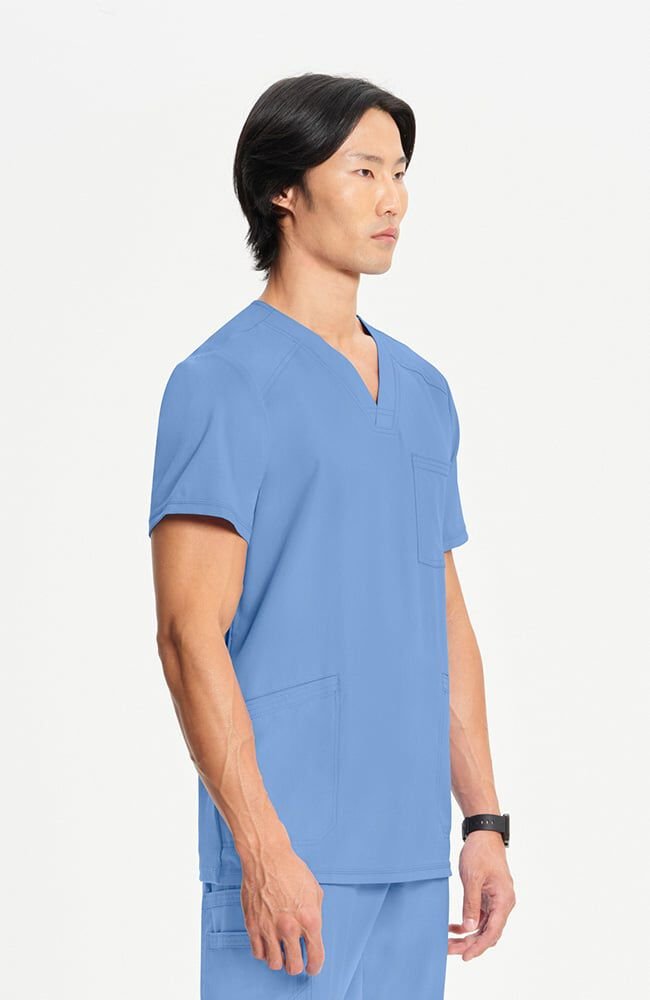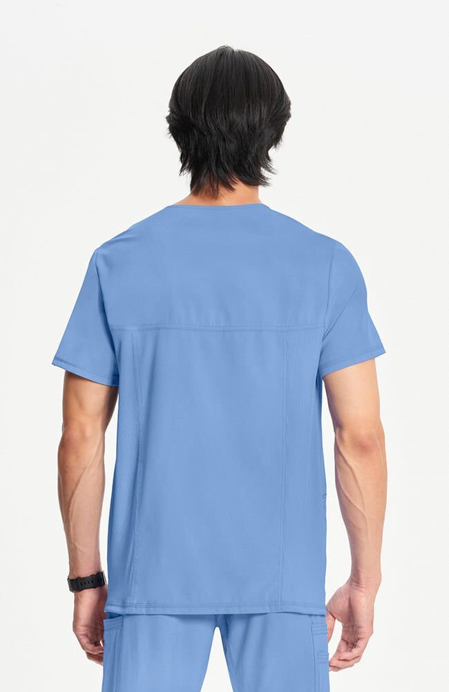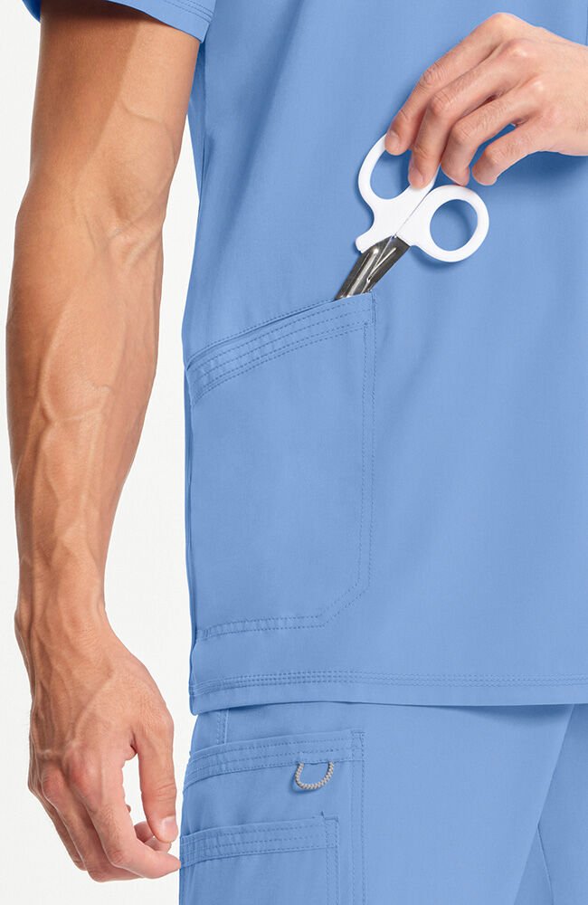 Scrubs caballeros celeste con cuello en V y bolsillo con cremallera de Cherokee cuenta con un bolsillo seguro con cremallera para guardar objetos, además de un dobladillo asimétrico que se puede meter por dentro para lograr un aspecto elegante y clásico.