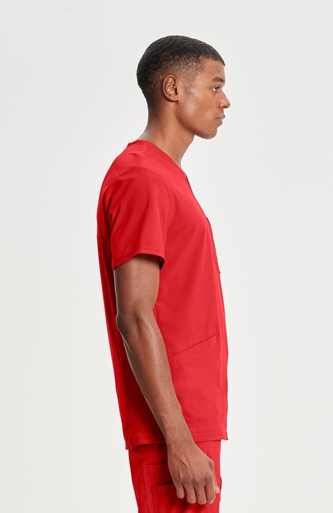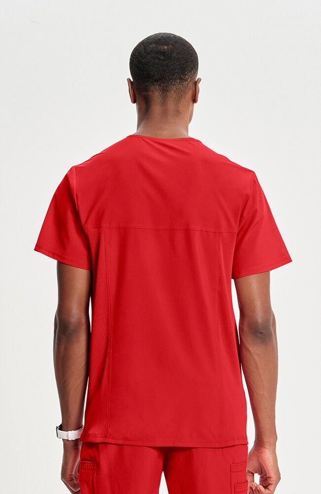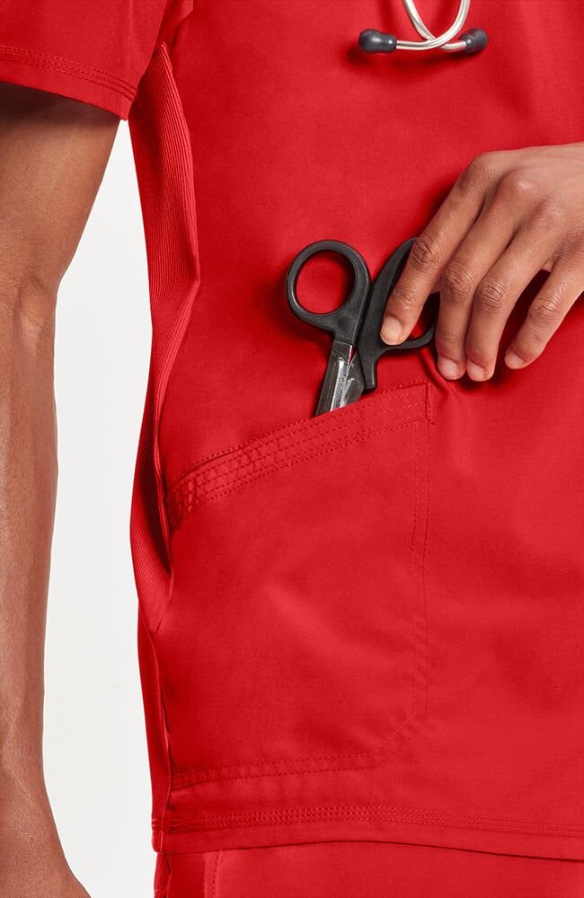 Scrubs caballeros rojo con cuello en V y bolsillo con cremallera de Cherokee cuenta con un bolsillo seguro con cremallera para guardar objetos, además de un dobladillo asimétrico que se puede meter por dentro para lograr un aspecto elegante y clásico.