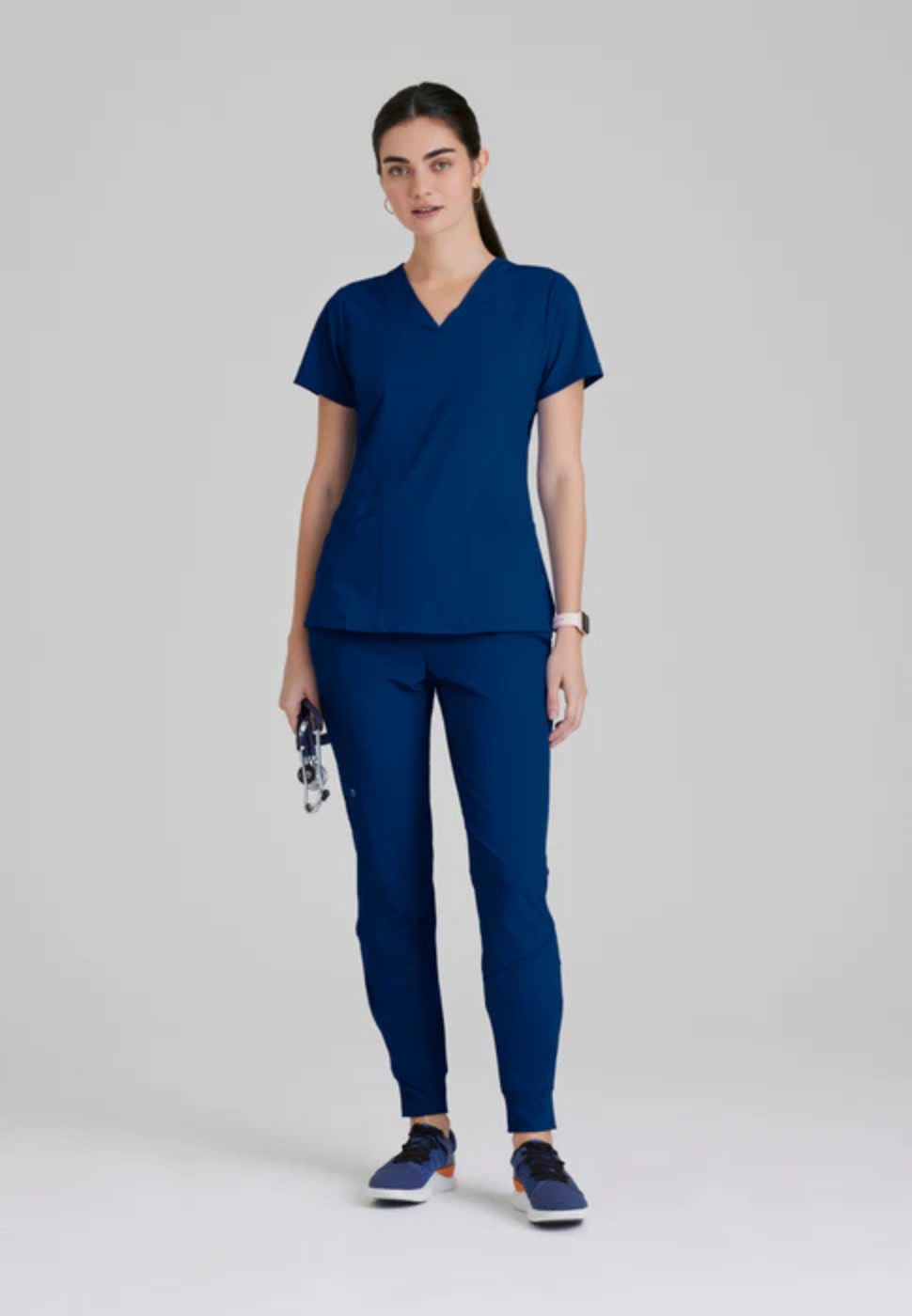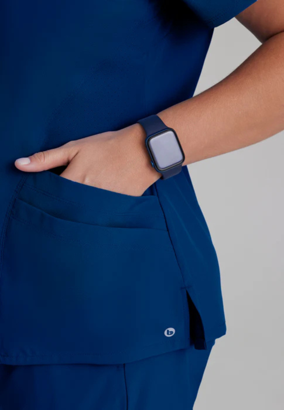 Scrubs damas navy con cuello en V redondeado combina un escote suave con un look profesional, cuenta con dos bolsillos inclinados en la parte inferior y pinzas que entallan la cintura, presilla para instrumentos, etiqueta con logo y presilla elástica. Tejido suave y ultraligero, ideal para cualquier turno. Es una versión elasticada de los modelos clásicos.